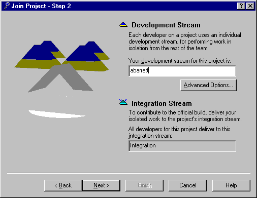 Enter the development stream name as your username (since we are using only one project/stream there is no need currently for more complex names). Press Next.