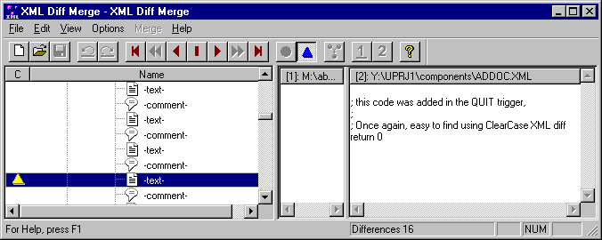 The XML Diff/Merge window is displayed. Since the ClearCase diff tool understands XML, it makes if very easy to find changes.