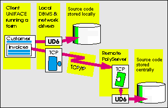 Uniface and Polyserver transparently handle situations where the driver / database is located on the local or a remote machine.