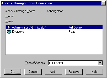 The final step in taking control, is to alter the NT share you created ‘echangeman’ for the source code, to be read-only. Alter the permissions on the share tab to allow the Administrator full-control and everyone read access only: