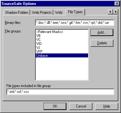Define a new file group for your Uniface source code, by pressing the Add button.
